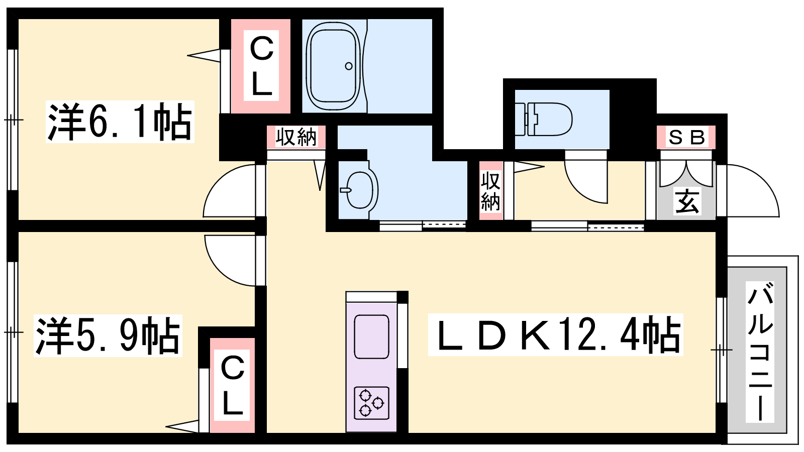 - LDK12.4帖、洋室6帖、洋室5.9帖