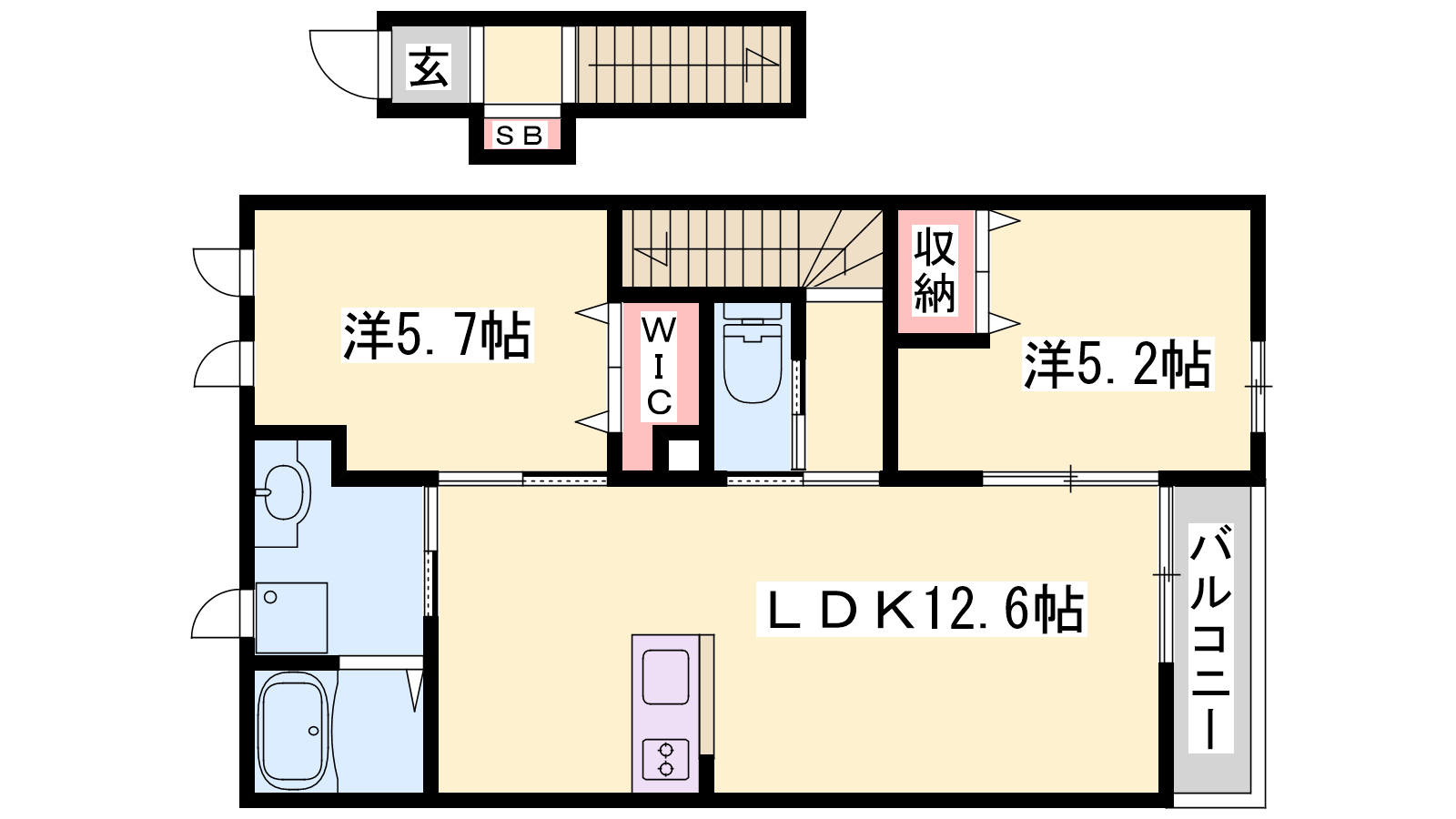 - LDK12.6帖、洋室5.7帖、洋室5.2帖