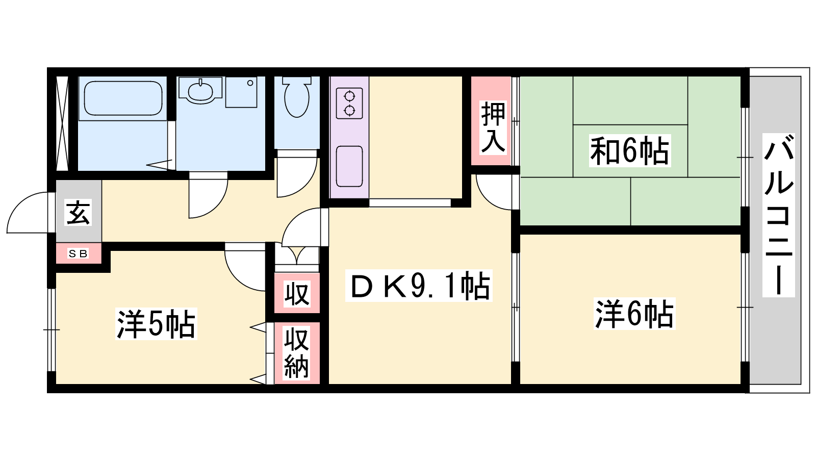 - DK9.1帖、洋室6帖、洋室5帖、和室6帖