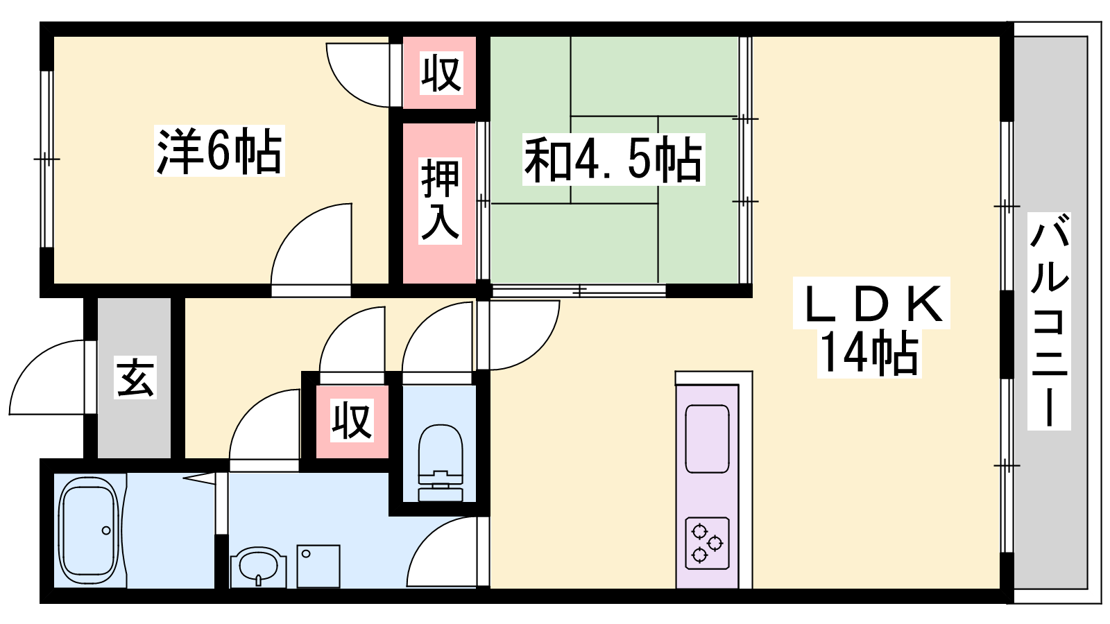 - LDK14帖、洋室6帖、和室4.5帖