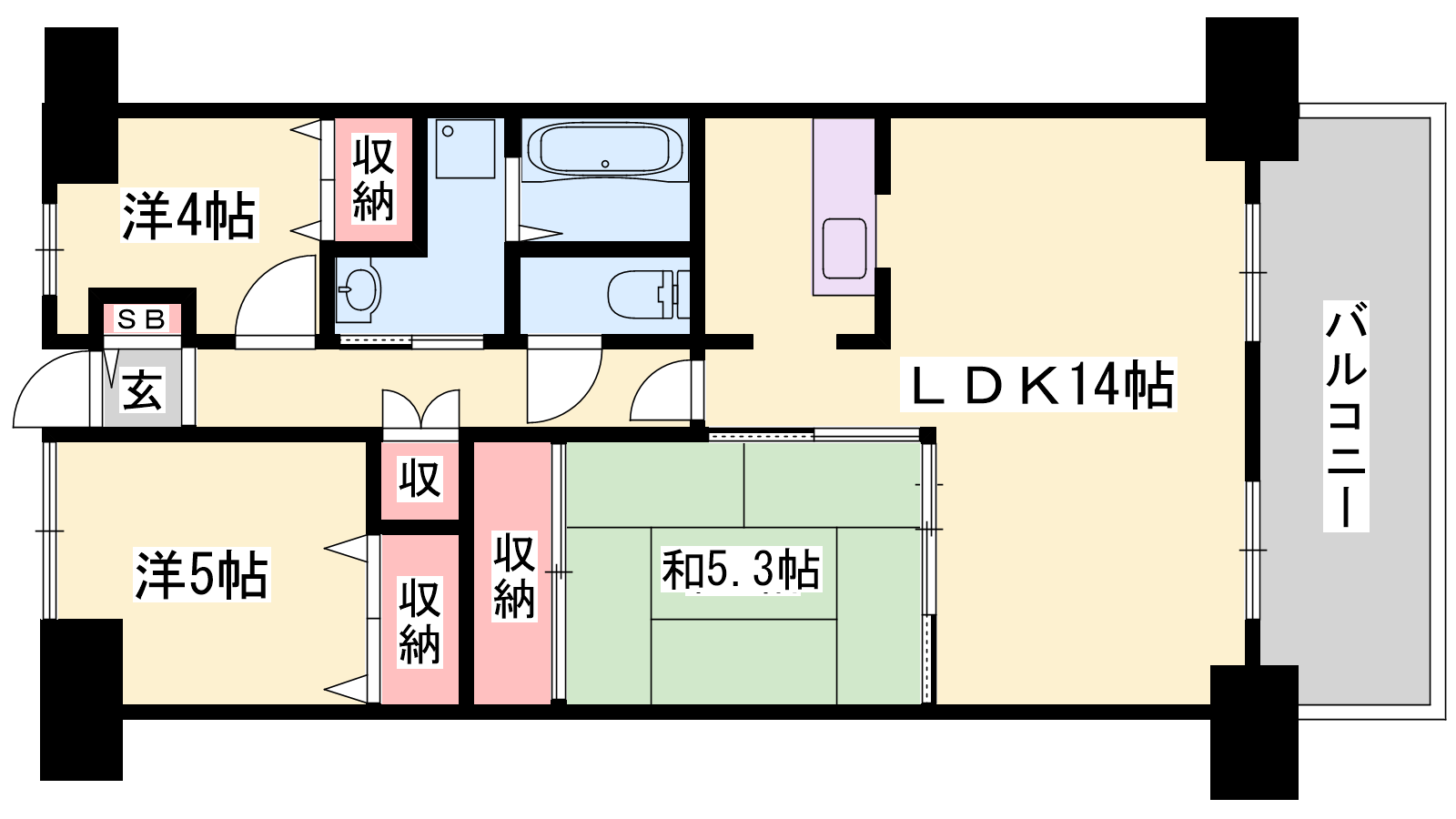 - LDK14帖、和室5.3帖、洋室5帖、洋室4帖