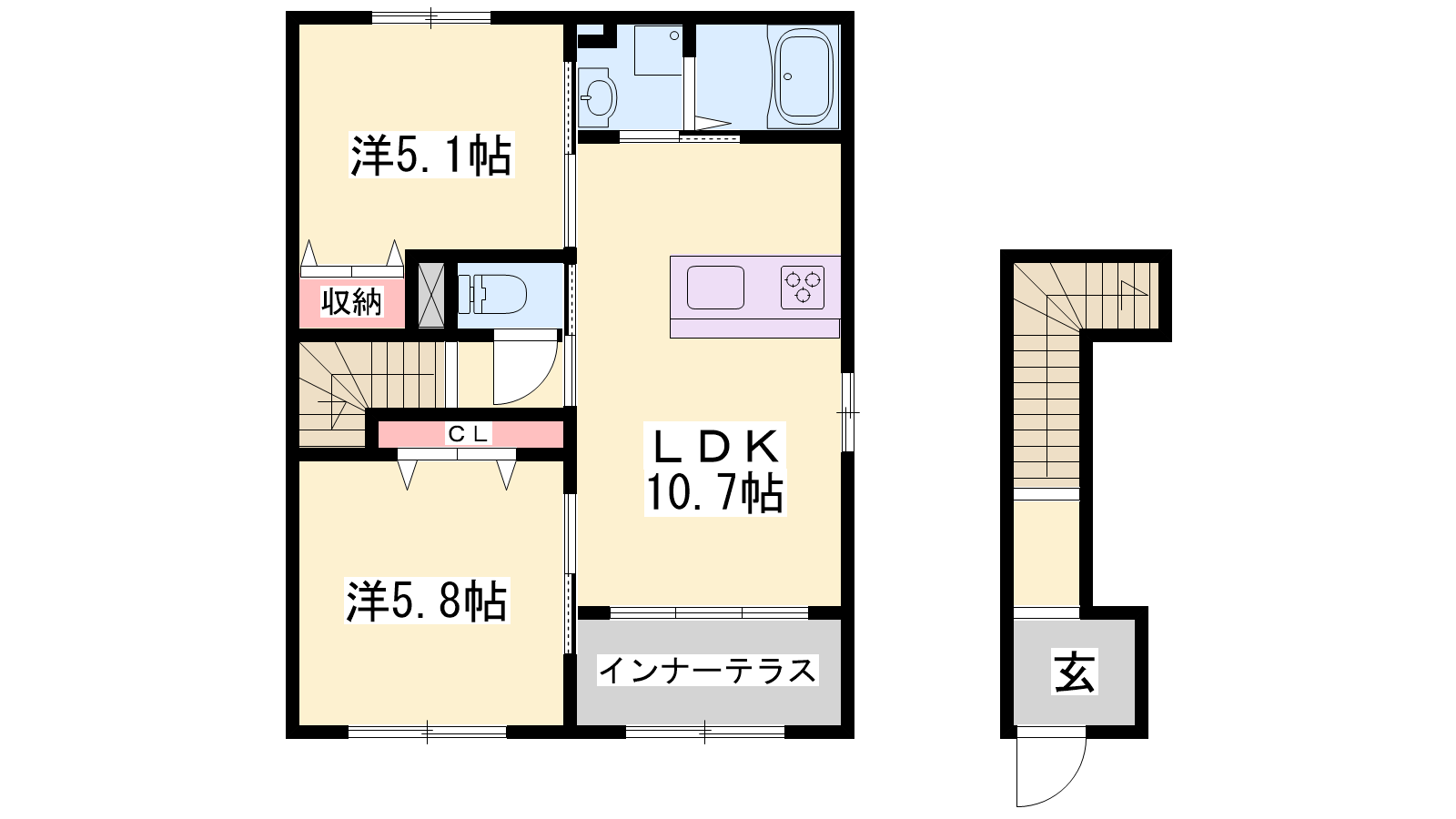 - LDK10.7帖、洋室5.8帖、洋室5.1帖