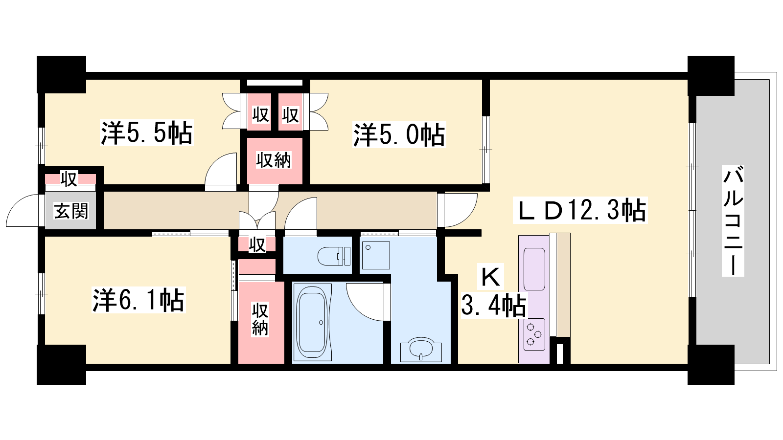 - LD12.3帖、K3.4帖、洋室6.1帖、洋室5.5帖、洋室5帖