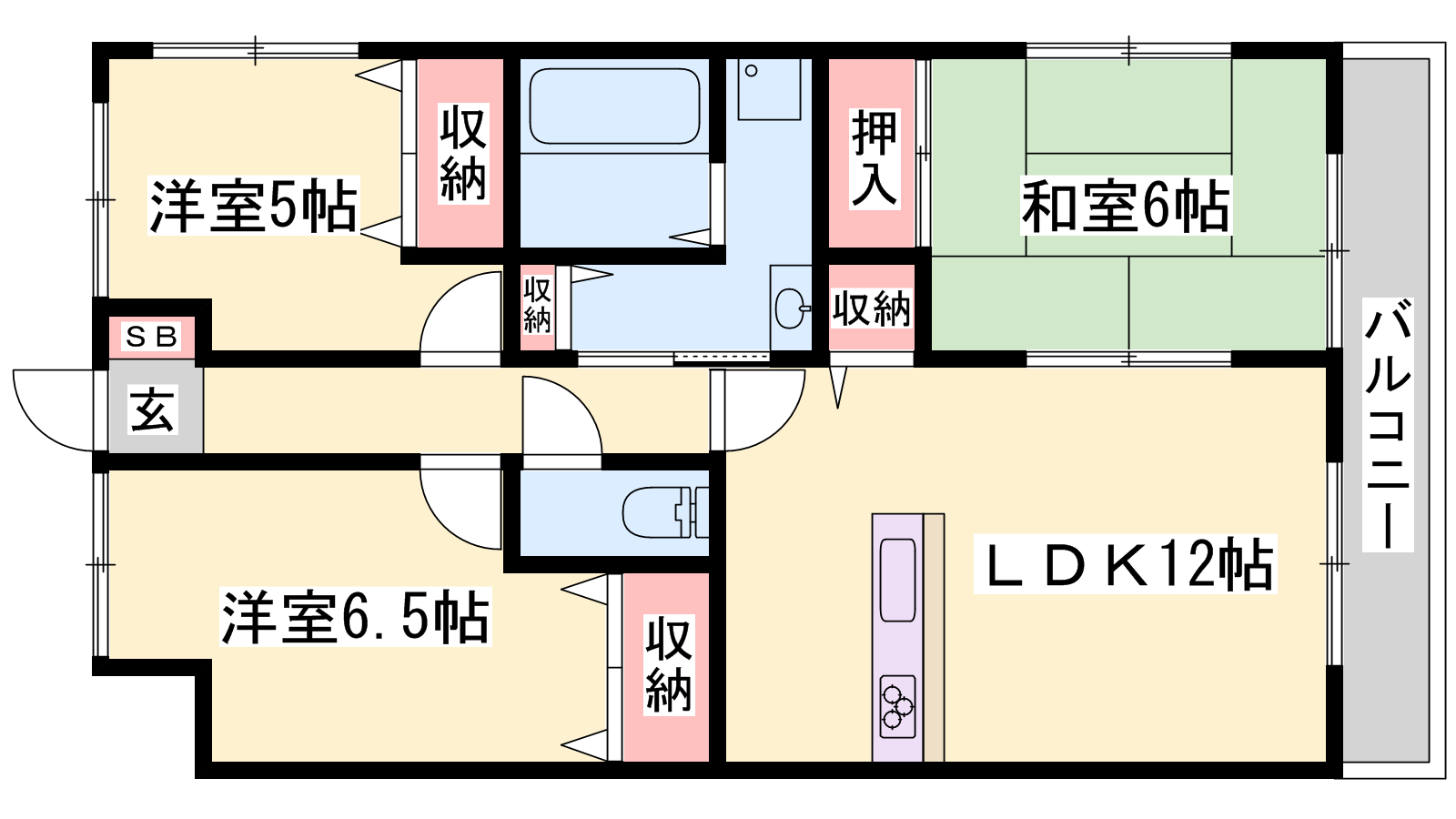 - LDK12帖、洋室6.5帖、洋室5帖、和室6帖