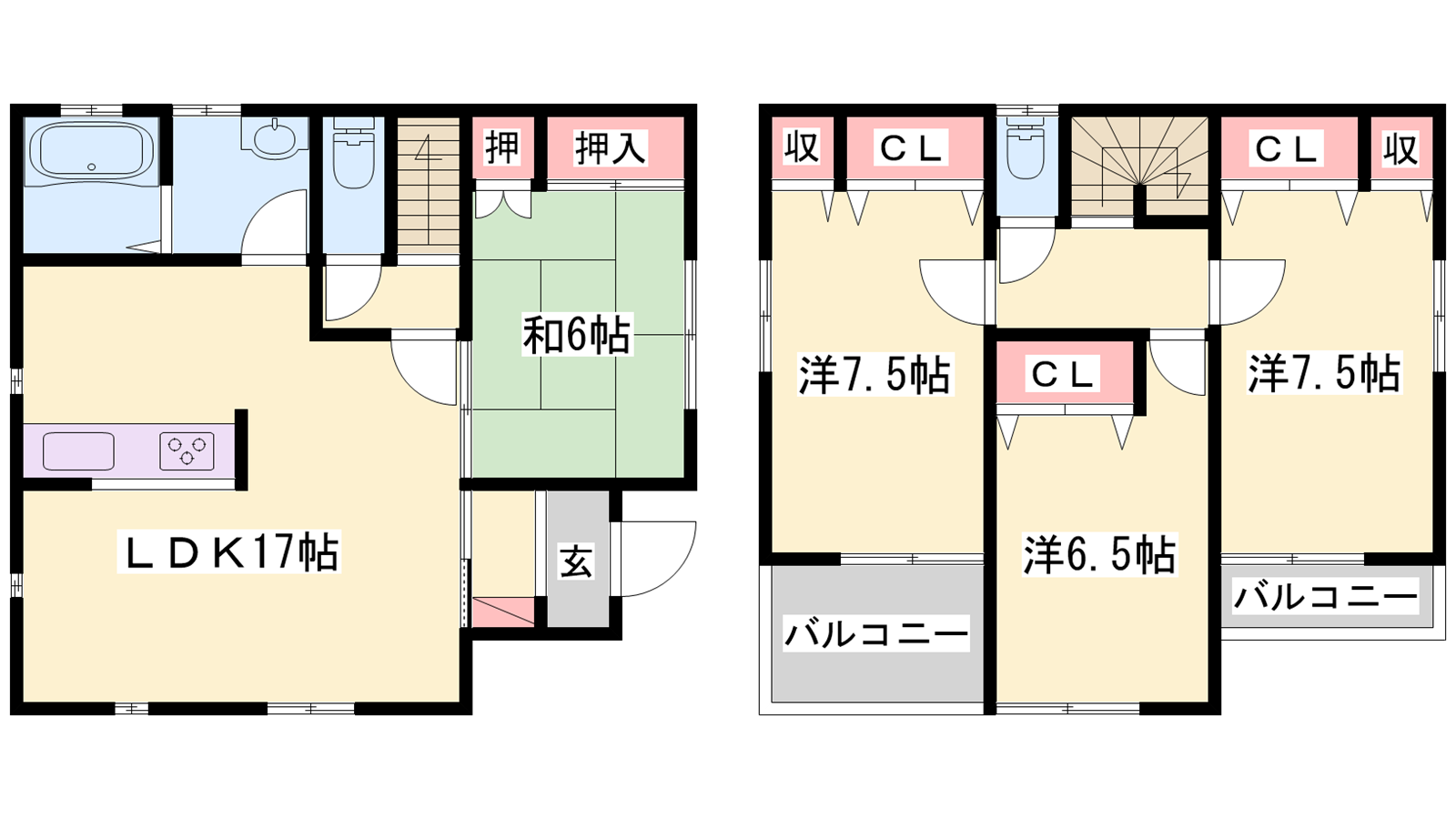 - LDK17帖、洋室7.5帖、洋室7.5帖、洋室6.5帖、和室6帖