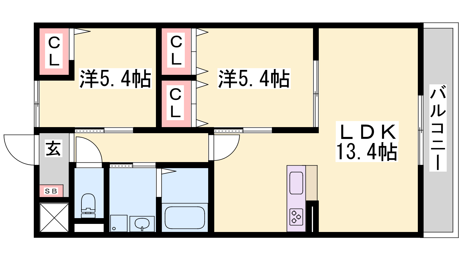 - LDK13.4帖、洋室5.4帖、洋室5.4帖