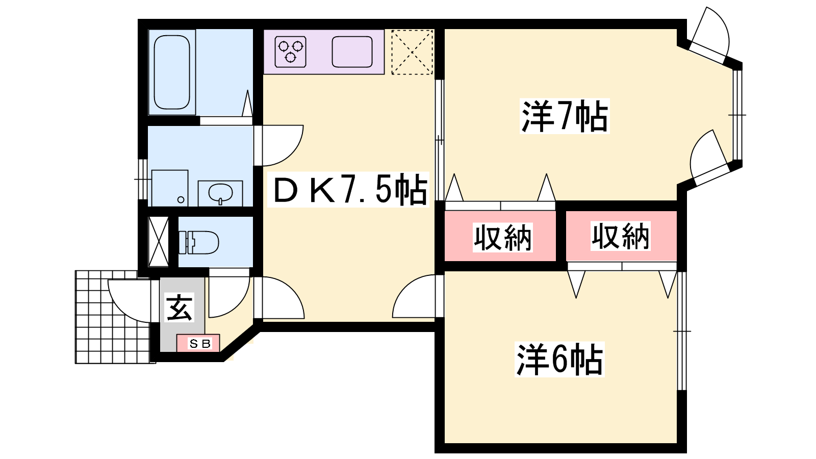- DK7.5帖、洋室7帖、洋室6帖