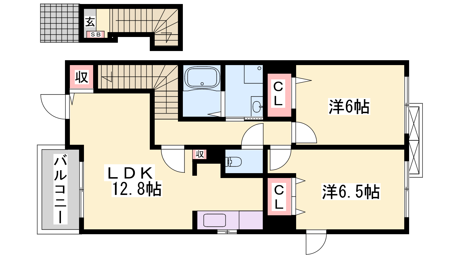 - LDK12.8帖、洋室6帖、洋室6.5帖