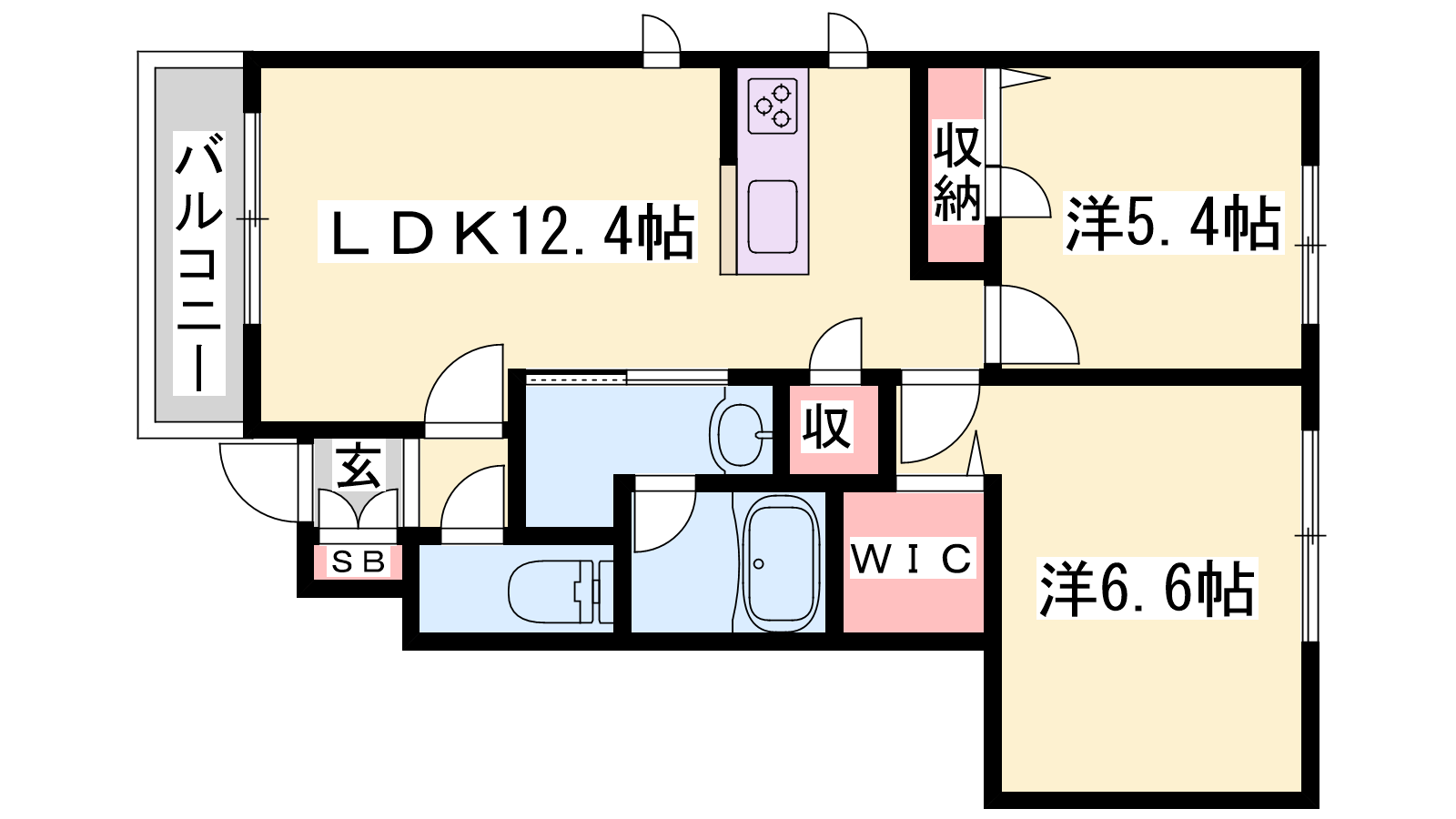 - LDK12.4帖、洋室6.6帖、洋室5.4帖