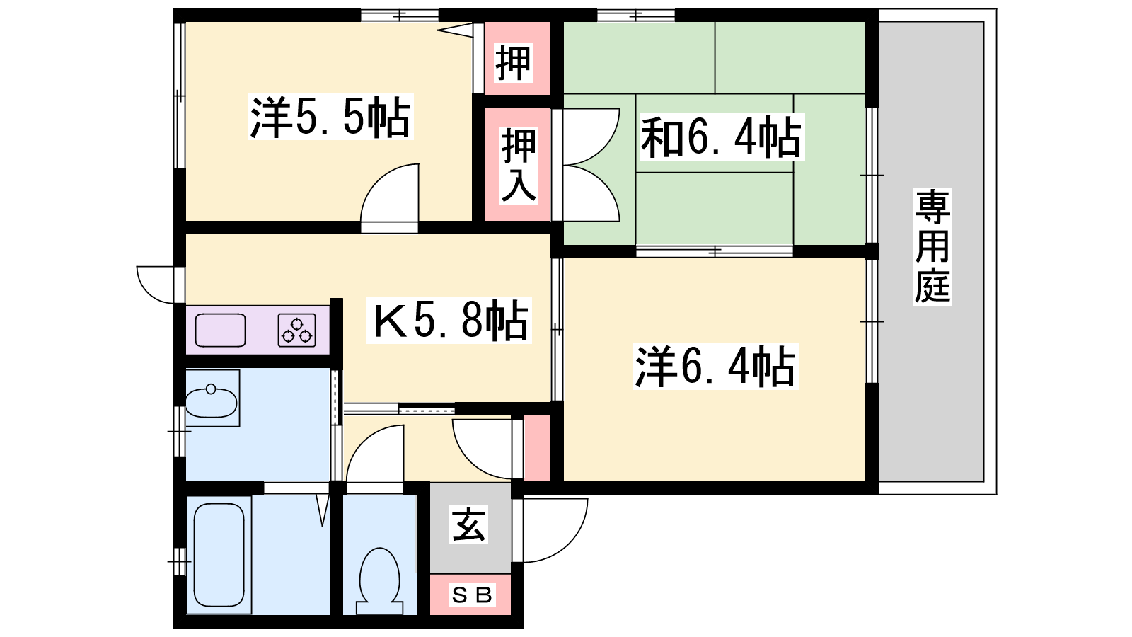 - K5.8帖、洋室6.4帖、和室6.4帖、洋室5.5帖