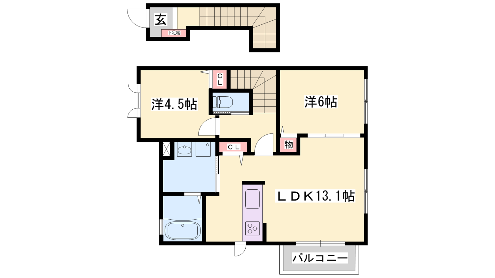 - LDK13帖、洋室6帖、洋室4.6帖