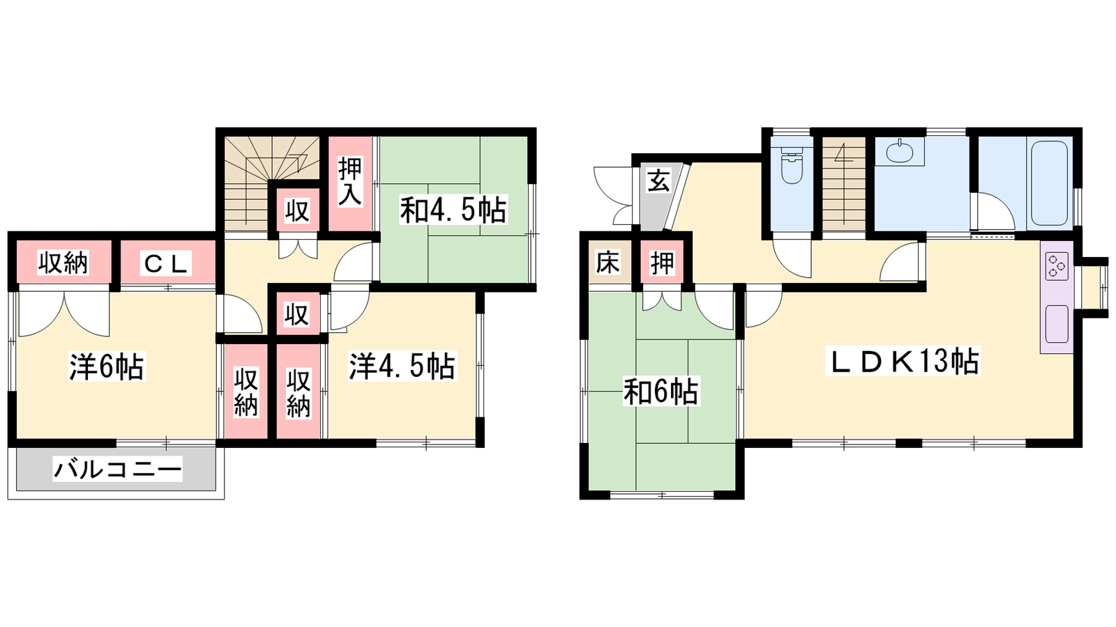 - LDK13帖、洋室6帖、洋室4.5帖、和室6帖、和室4.5帖
