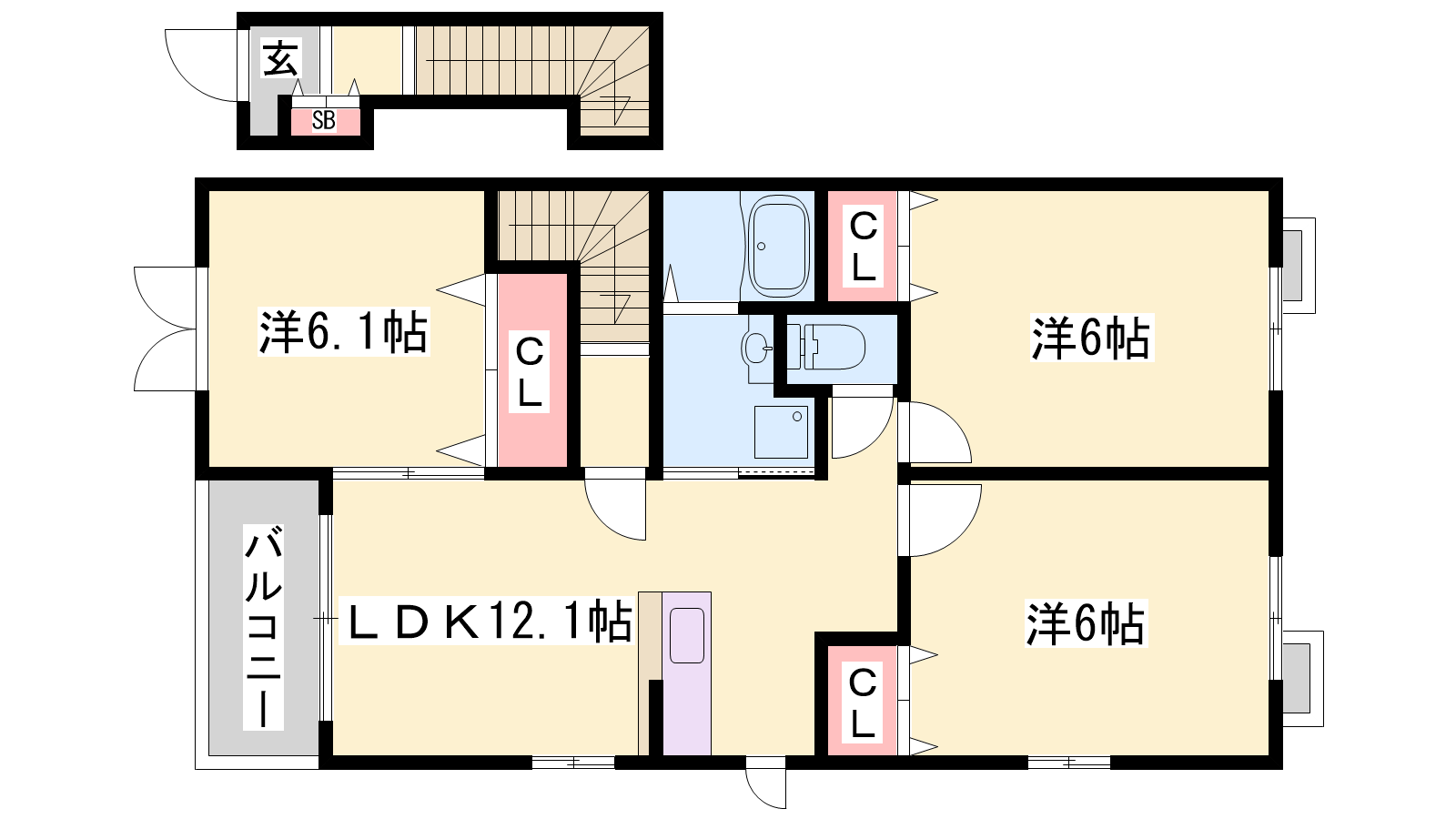 - LDK12.1帖、洋室6.1帖、洋室6帖、洋室6帖