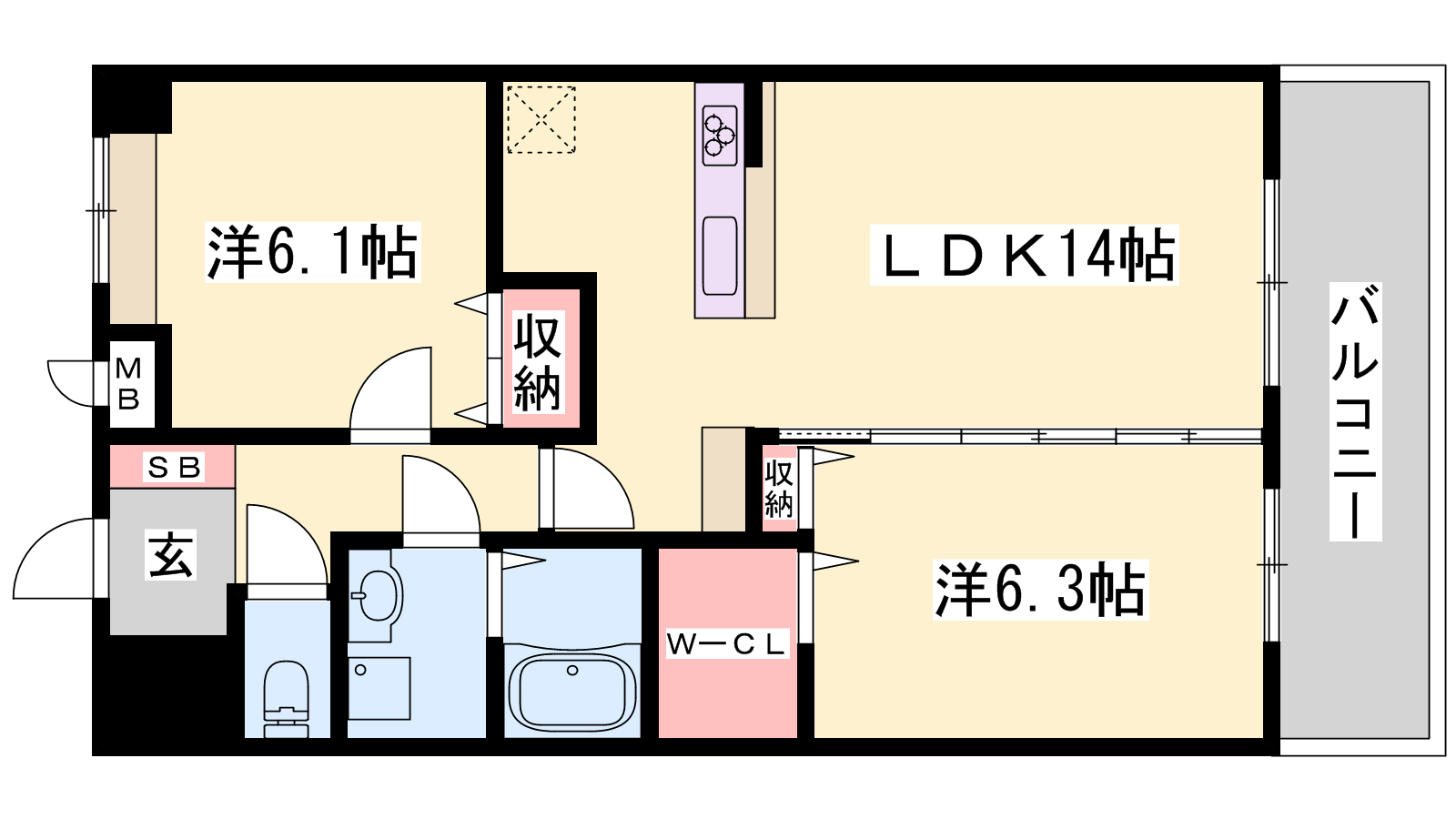 - LDK14帖、洋室6.3帖、洋室6.1帖