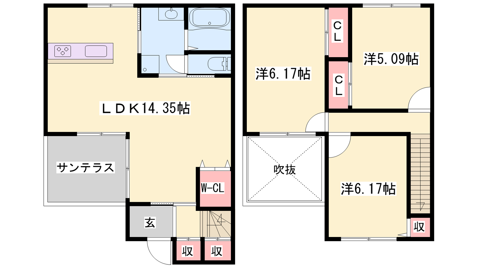 - LDK14.35帖、洋室6.17帖、洋室6.17帖、洋室5.09帖