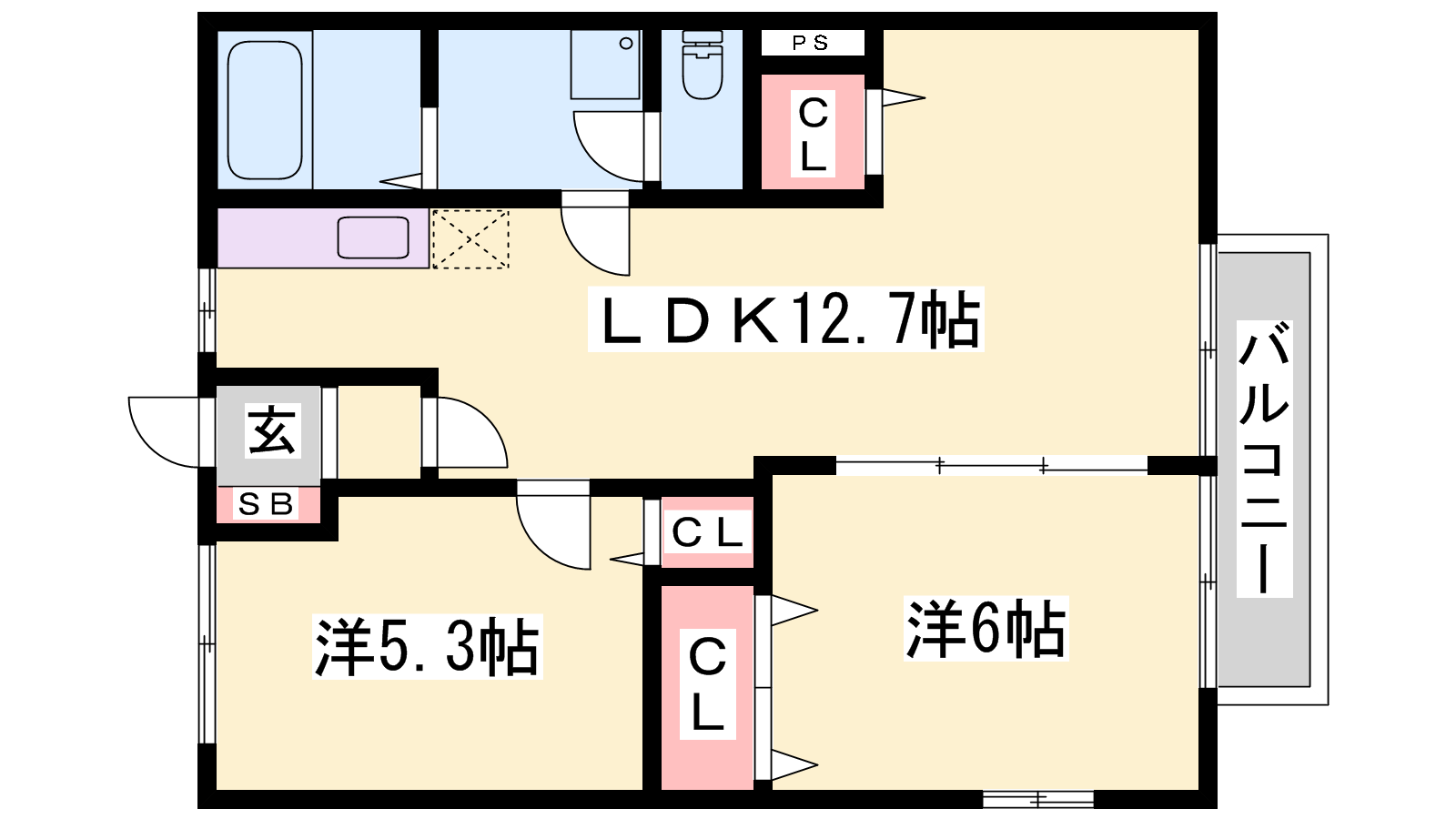 - LDK12.7帖、洋室6帖、洋室5.3帖