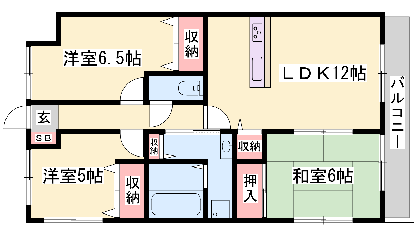 - LDK12帖、洋室5帖、洋室6.5帖、和室6帖