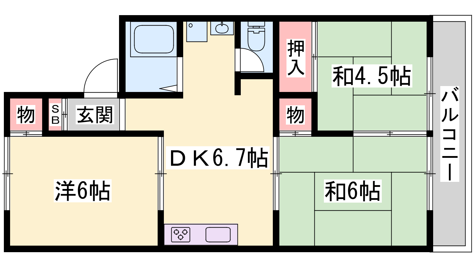 - DK6.7帖、洋室6帖、和室6帖、和室4.5帖