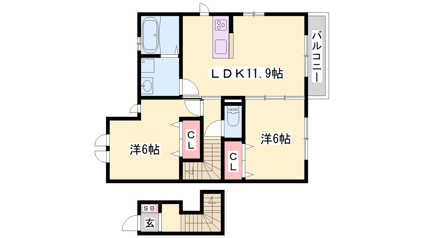 - LDK11.9帖、洋室6帖、洋室6帖