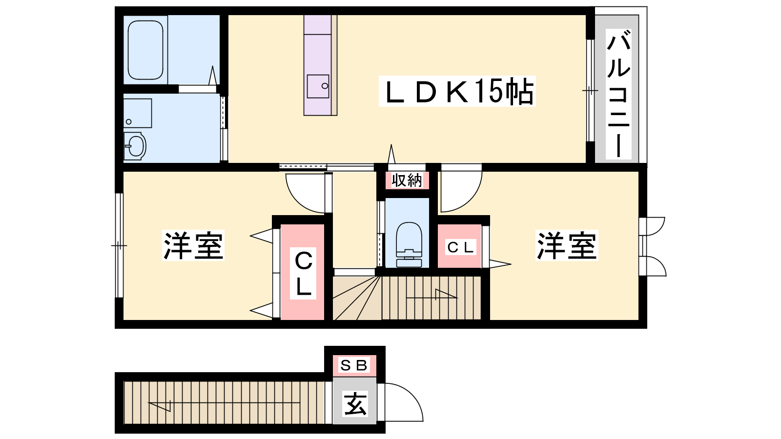 - LDK15帖、洋室6.4帖、洋室6.1帖