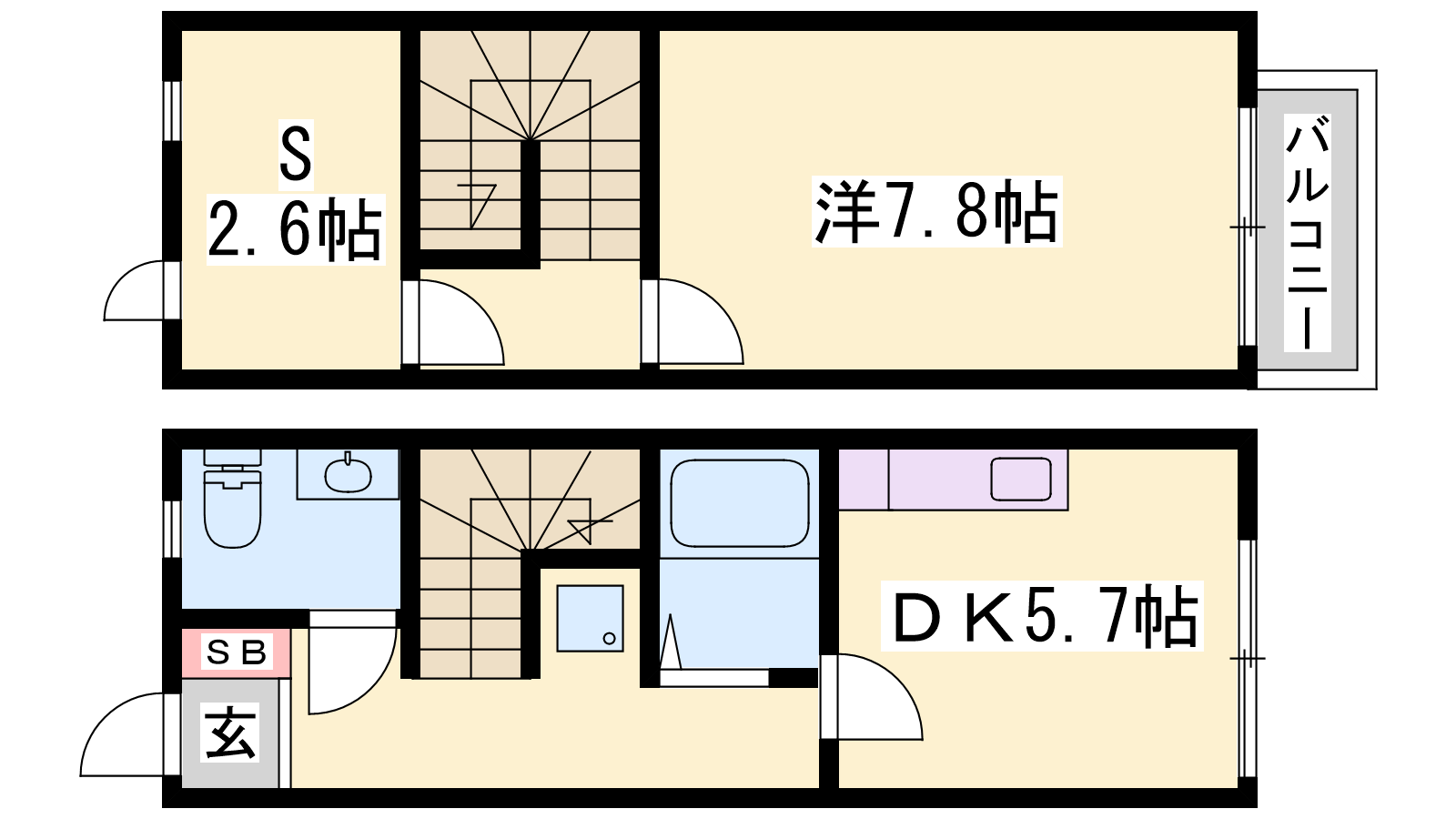 - DK5.7帖、洋室7.8帖、S2.6帖