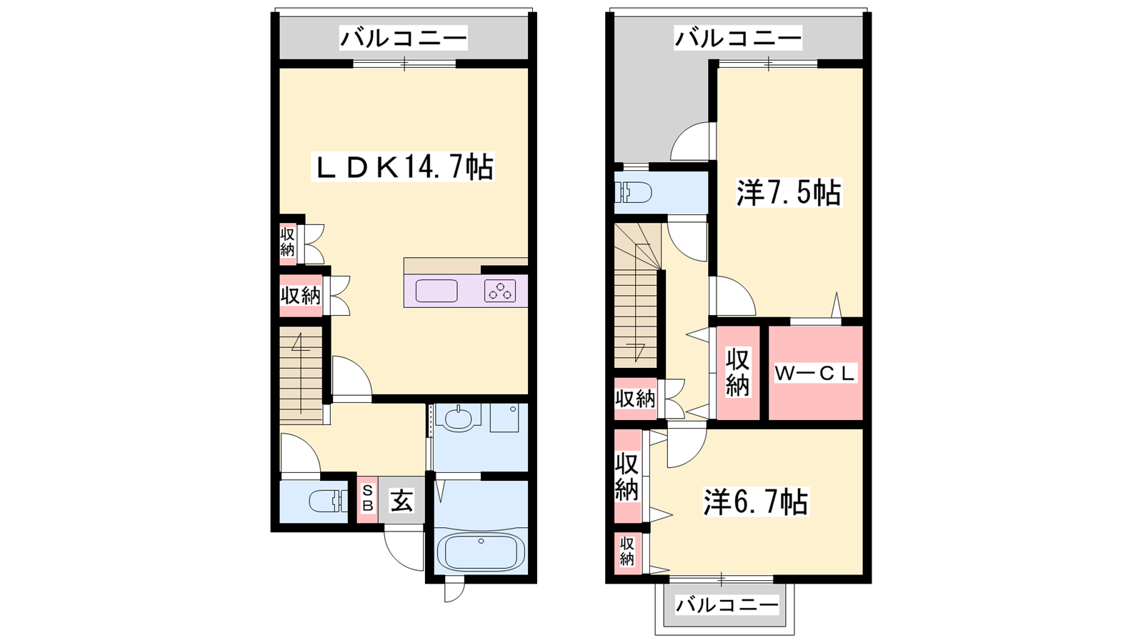 - LDK14.7帖、洋室7.5帖、洋室6.7帖