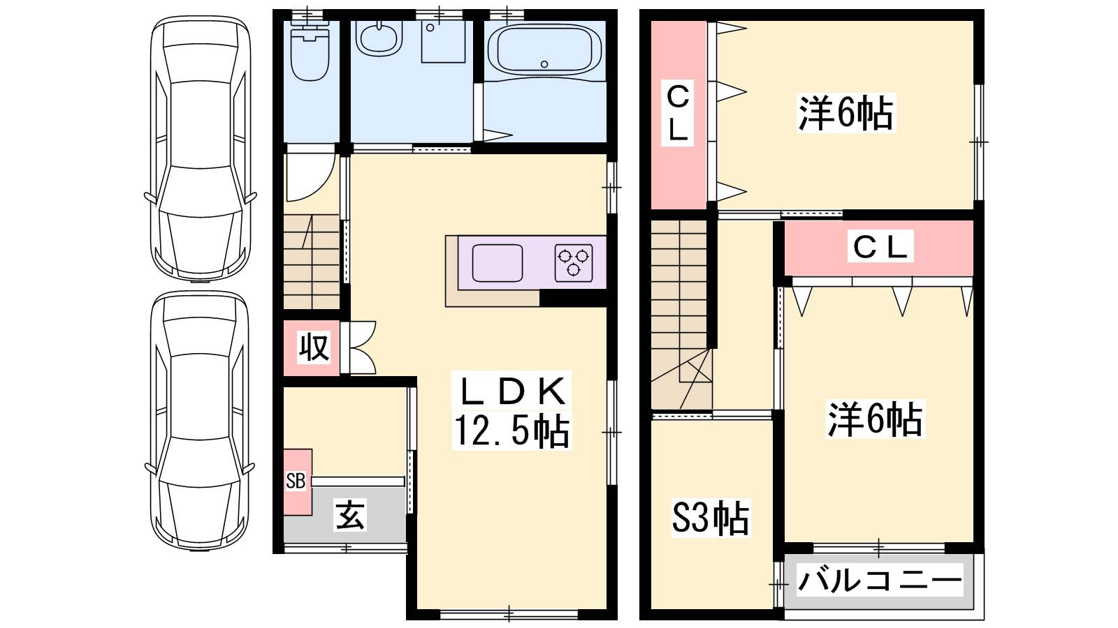 - LDK12.5帖、洋室6帖、洋室6帖、S3帖