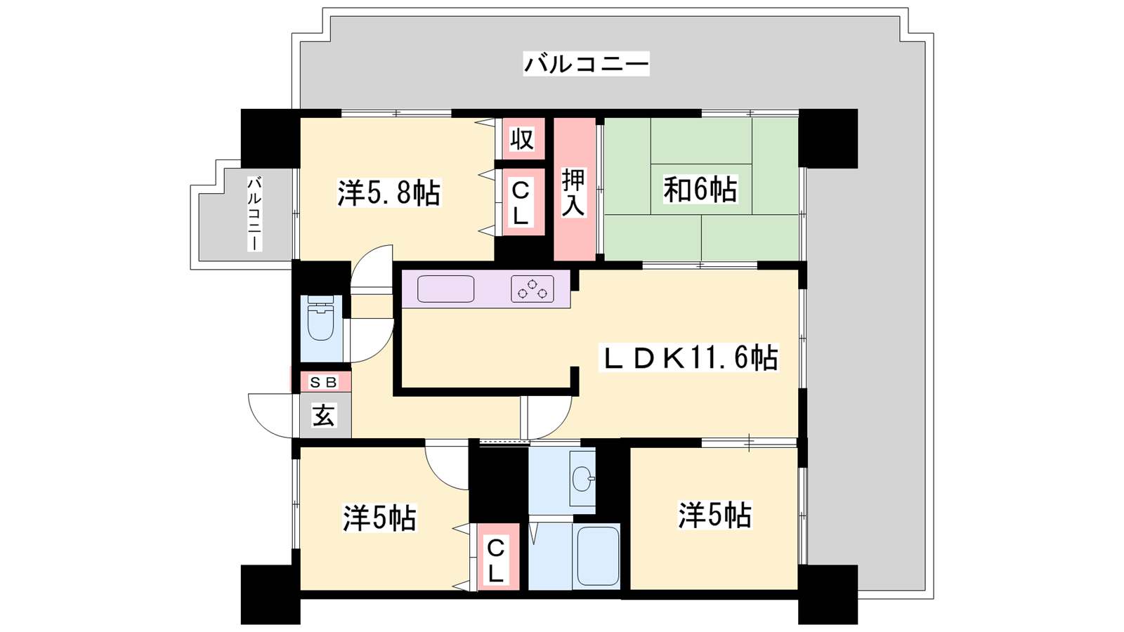 - LDK11.6帖、和室6帖、洋室5.8帖、洋室5帖、洋室5帖