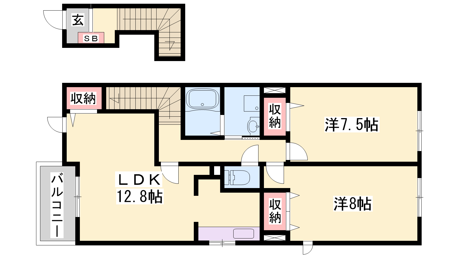 - LDK12.8帖、洋室8帖、洋室7.5帖