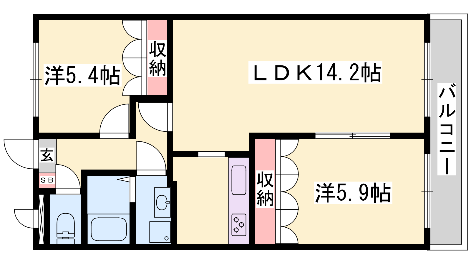 - LDK14.2帖、洋室5.9帖、洋室5.4帖