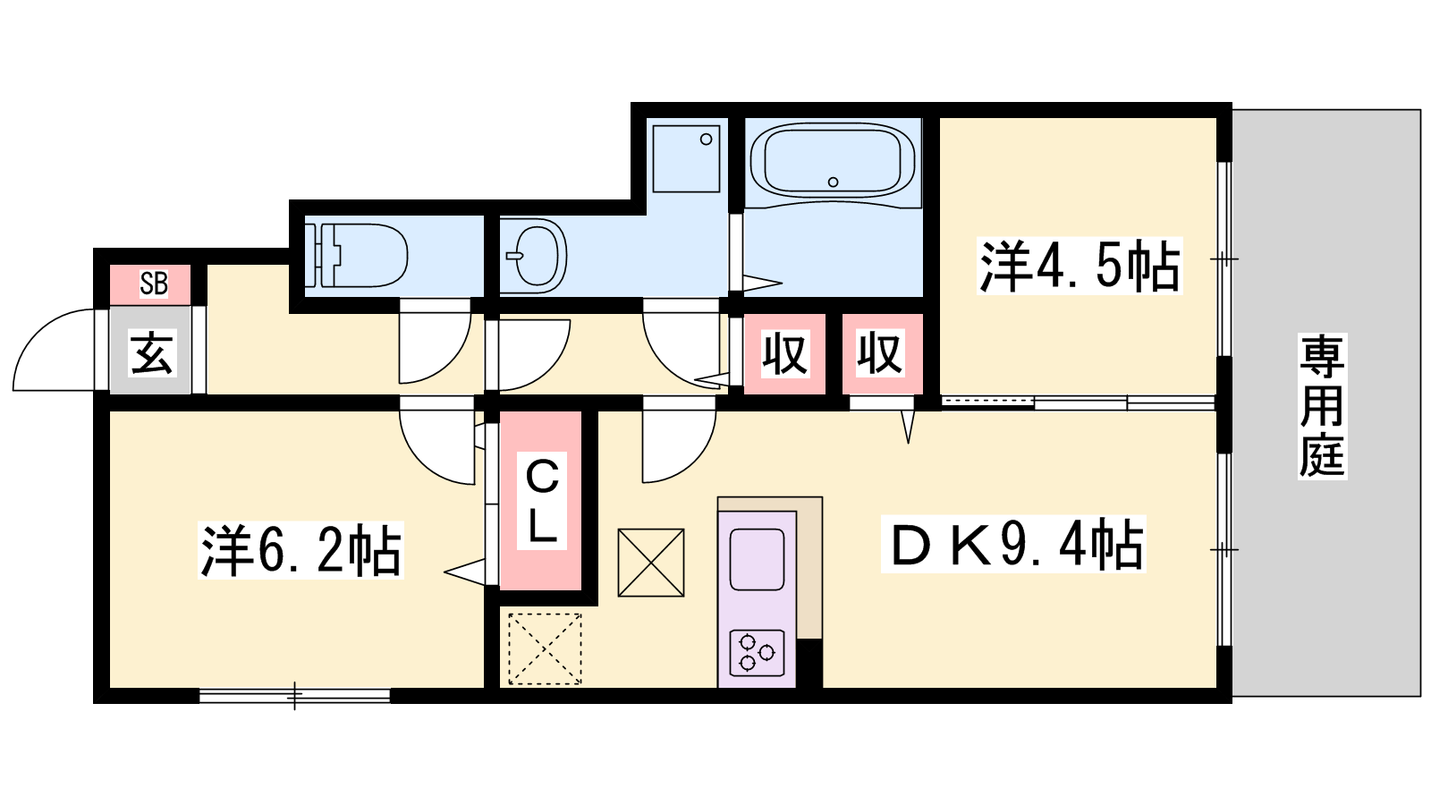 - DK9.4帖、洋室6.2帖、洋室4.5帖
