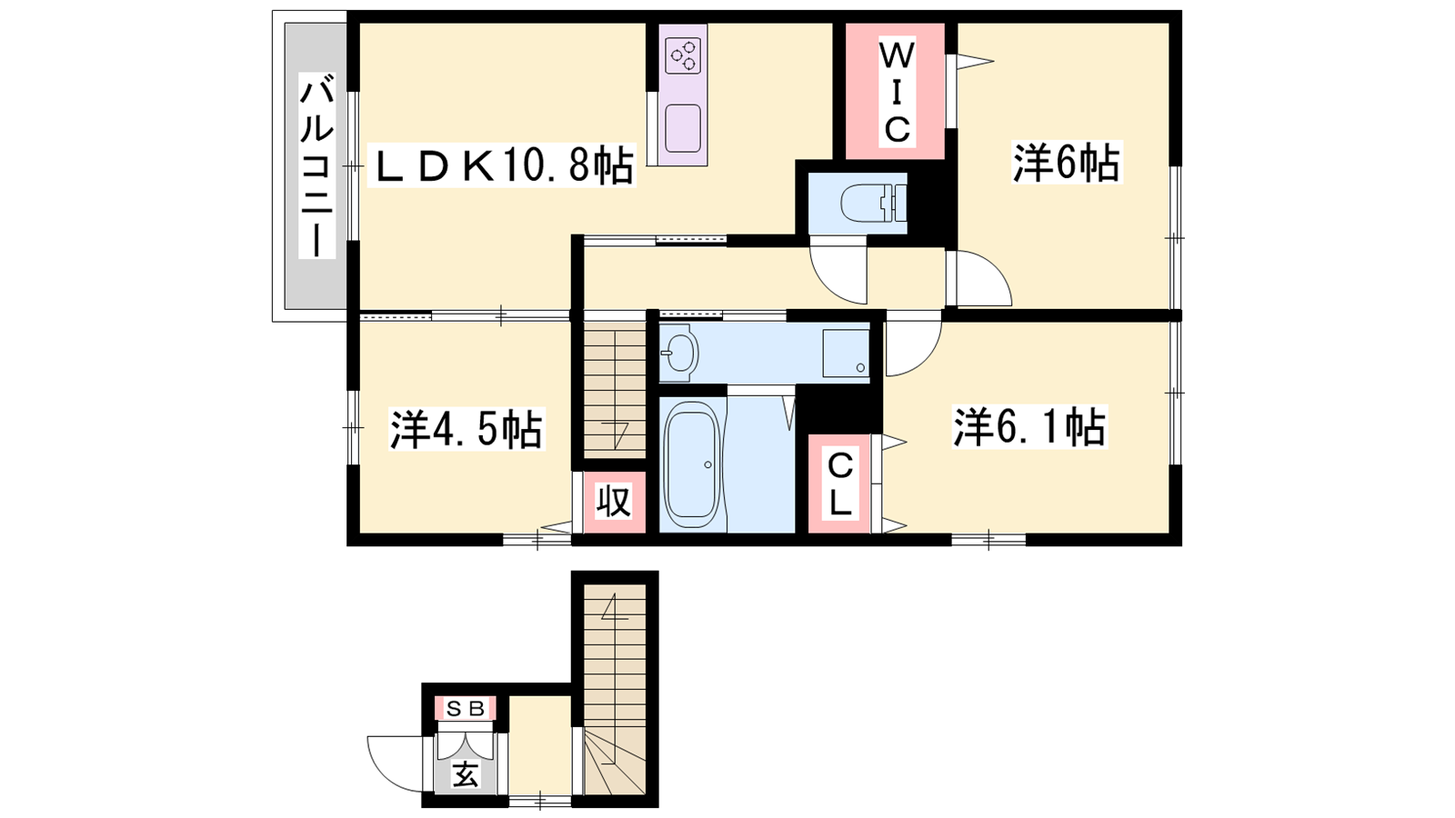 - LDK10.8帖、洋室6.1帖、洋室6帖、洋室4.5帖