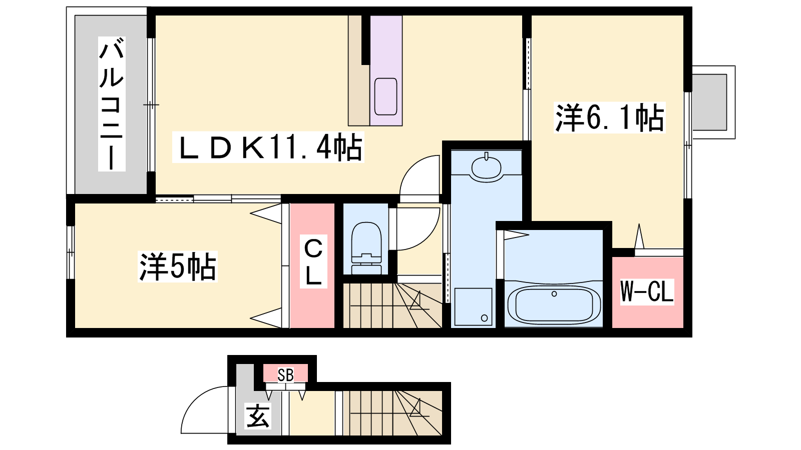 - LDK11.4帖、洋室6.1帖、洋室5帖