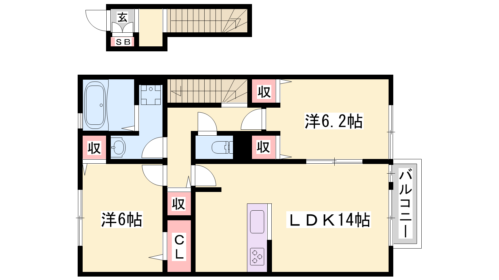 - LDK14帖、洋室6.2帖、洋室6帖