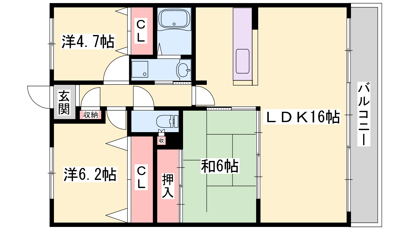 - LDK16帖、洋室6.2帖、洋室4.7帖、和室6帖