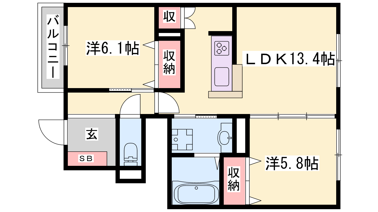 - LDK13.4帖、洋室6.1帖、洋室5.8帖