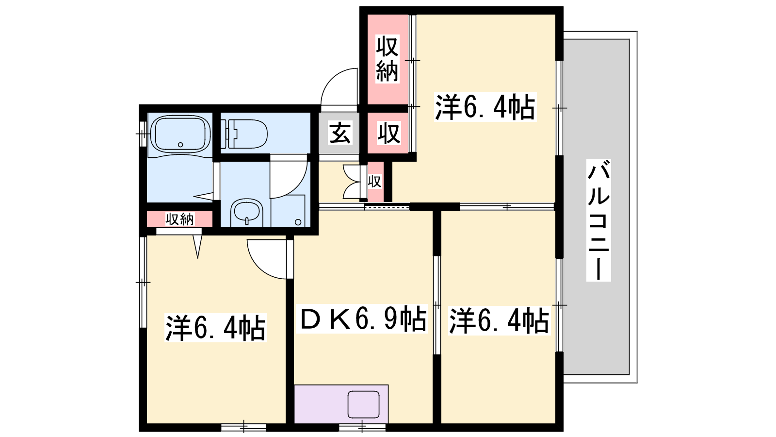 - DK6.9帖、洋室6.4帖、洋室6.4帖、洋室6.1帖