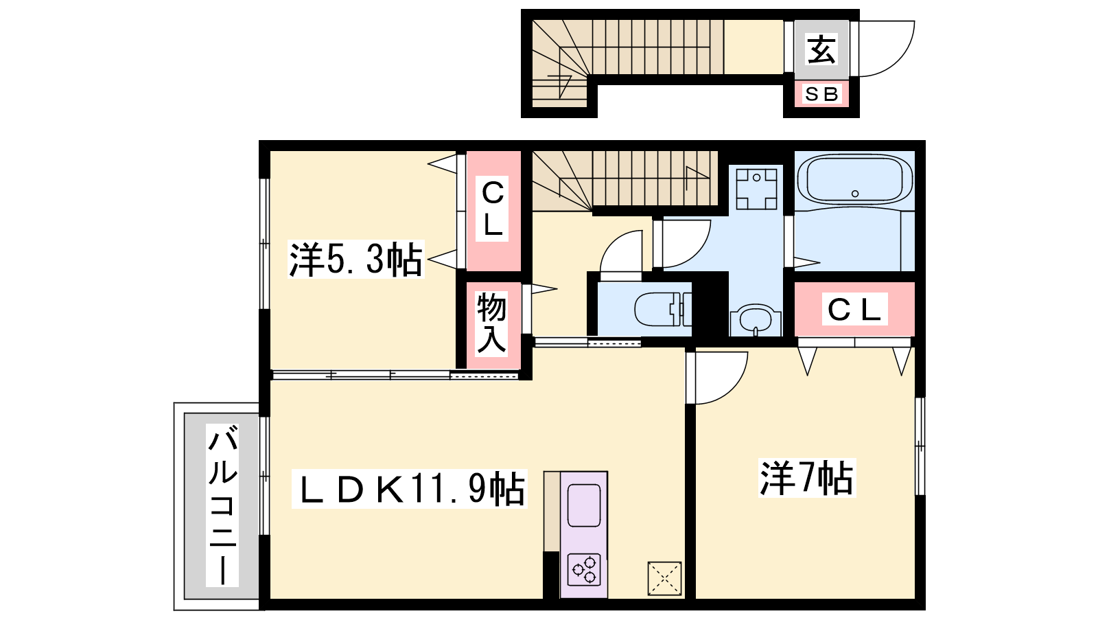 - LDK11.9帖、洋室7帖、洋室5.3帖