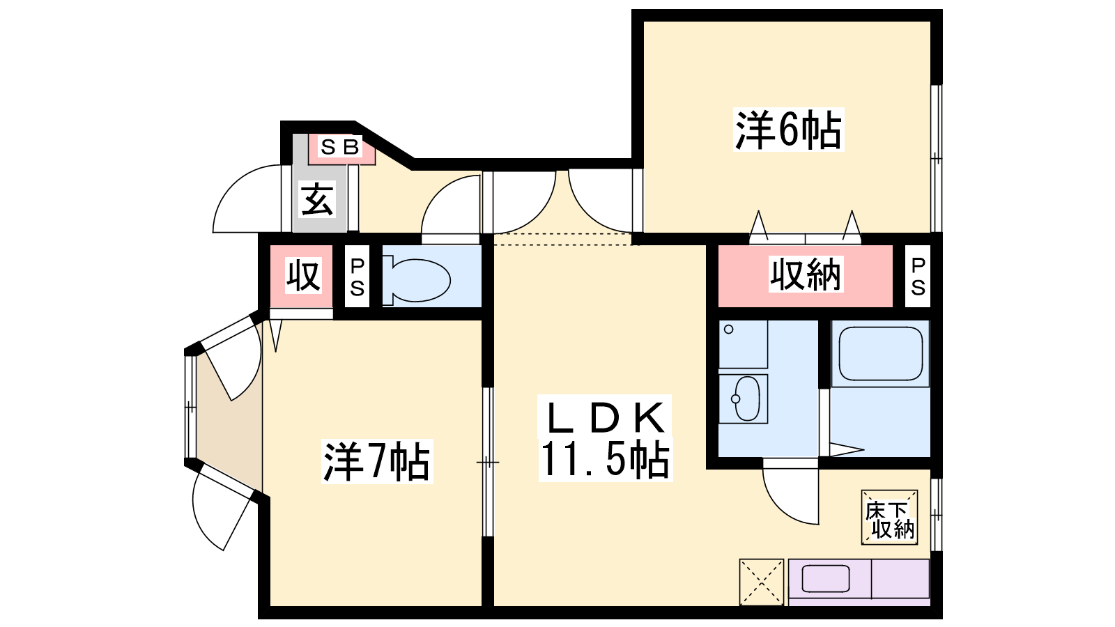 - LDK11.5帖、洋室7帖、洋室6帖