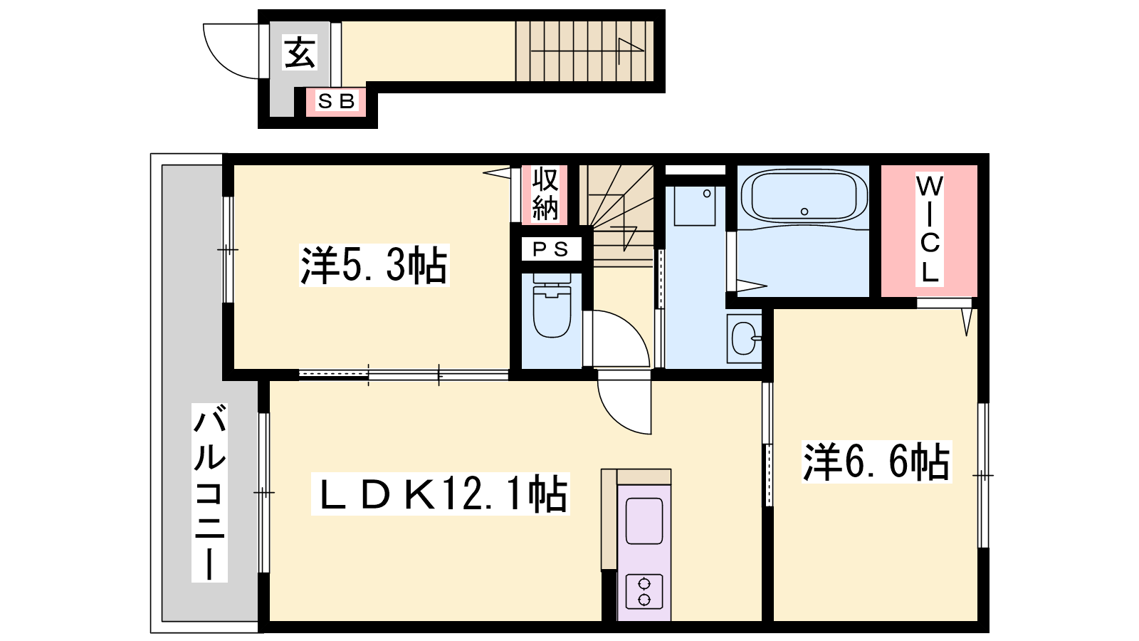 - LDK12.1帖、洋室6.6帖、洋室5.3帖