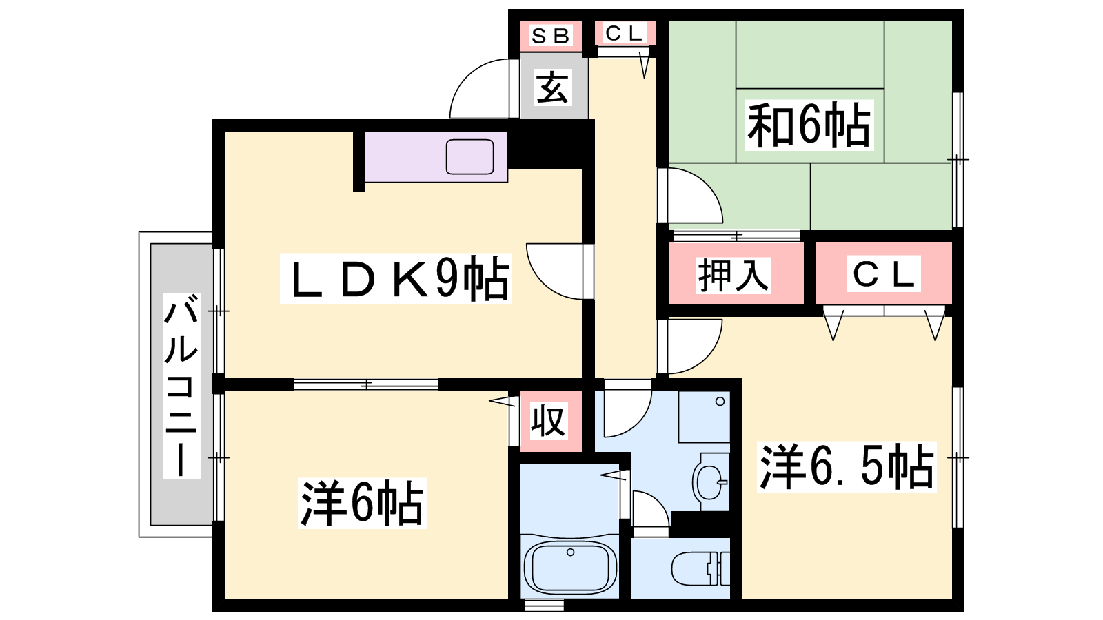- LDK9帖、洋室6.5帖、洋室6帖、和室6帖