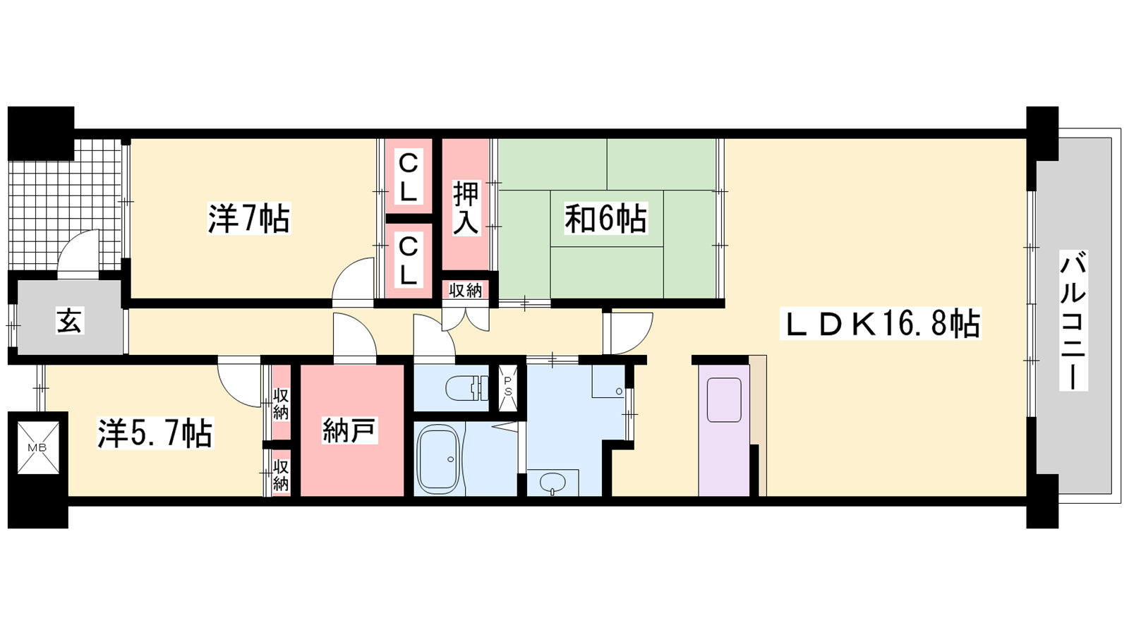 - LDK16.8帖、洋室7帖、洋室5.7帖、和室6帖、S2.5帖