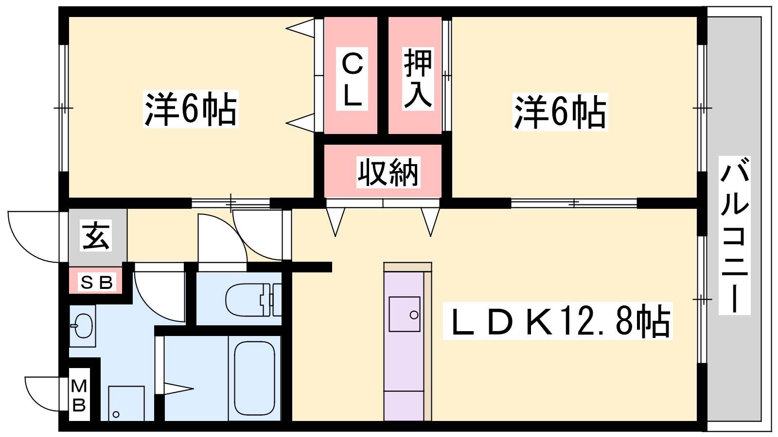 - LDK12.8帖、洋室6帖、洋室6帖