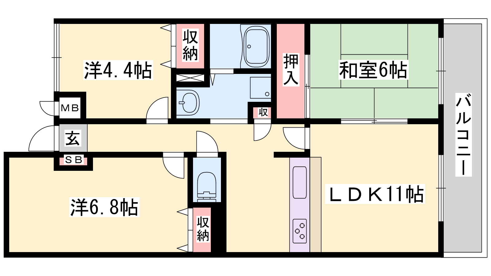 - LDK11帖、和室6帖、洋室6.8帖、洋室4.4帖