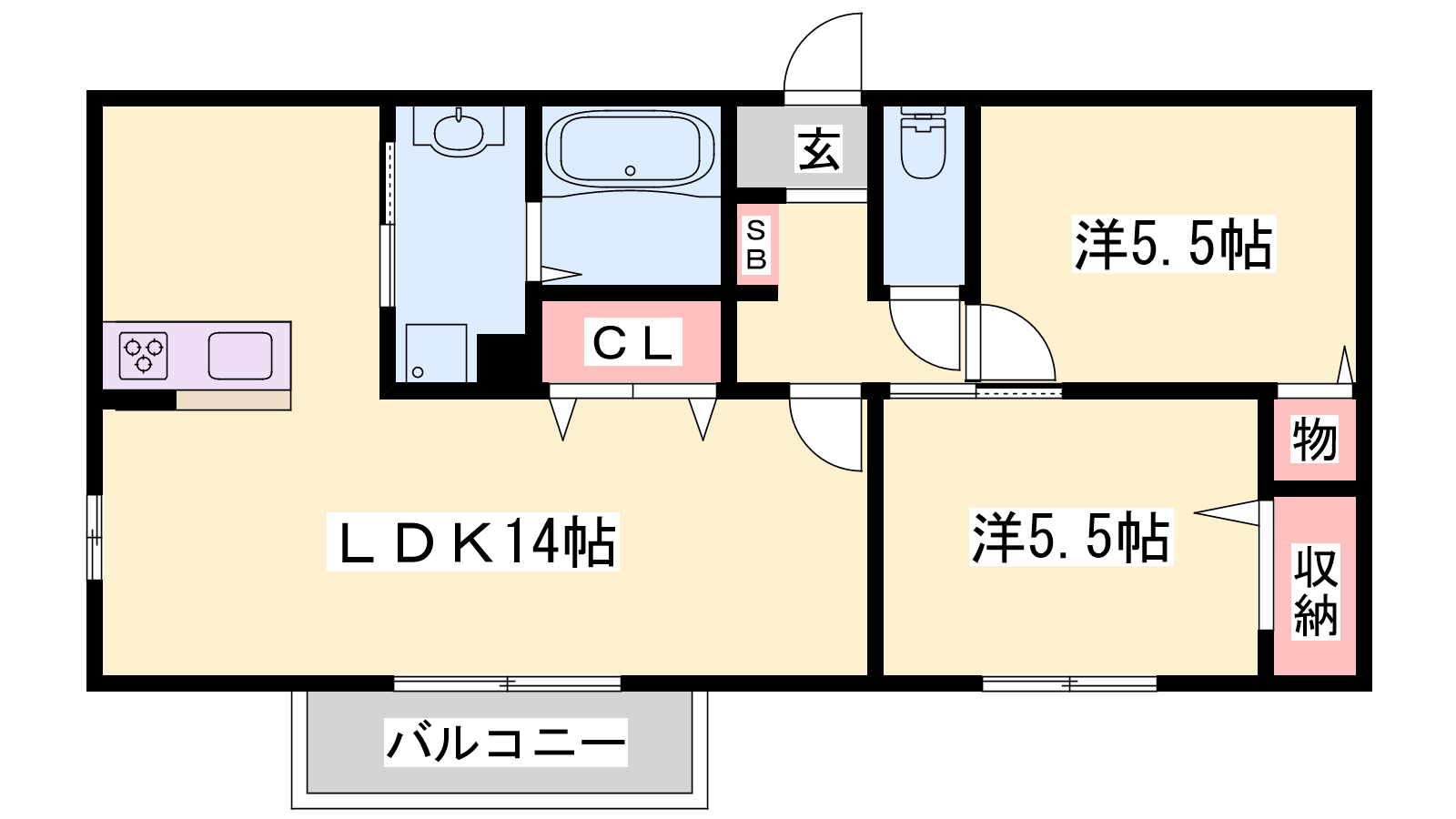 - LDK14帖、洋室5.5帖、洋室5.5帖