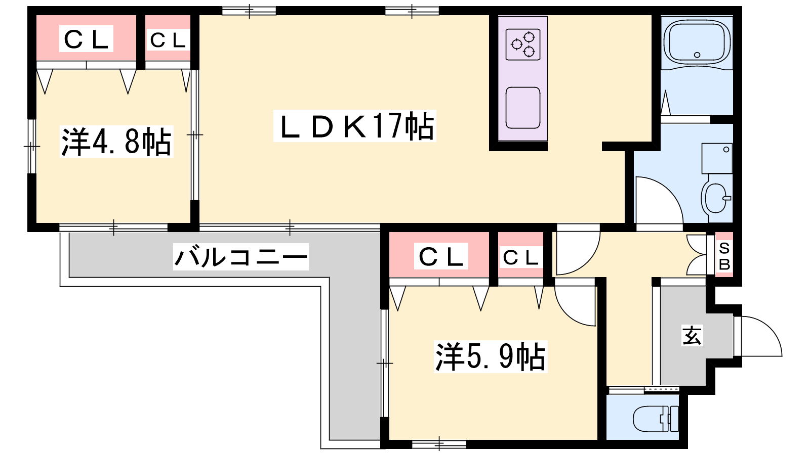 - LDK17帖、洋室5.9帖、洋室4.8帖