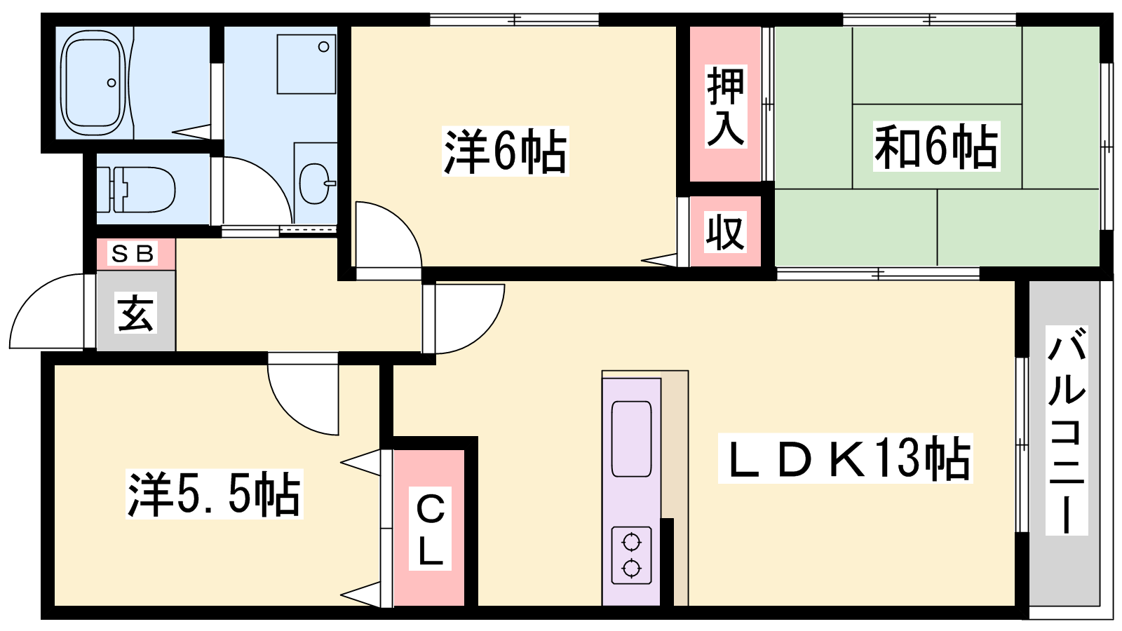 - LDK13帖、洋室6帖、洋室5.5帖、和室6帖