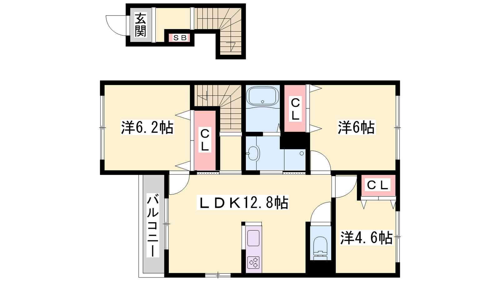- LDK12.8帖、洋室6.2帖、洋室6帖、洋室4.6帖