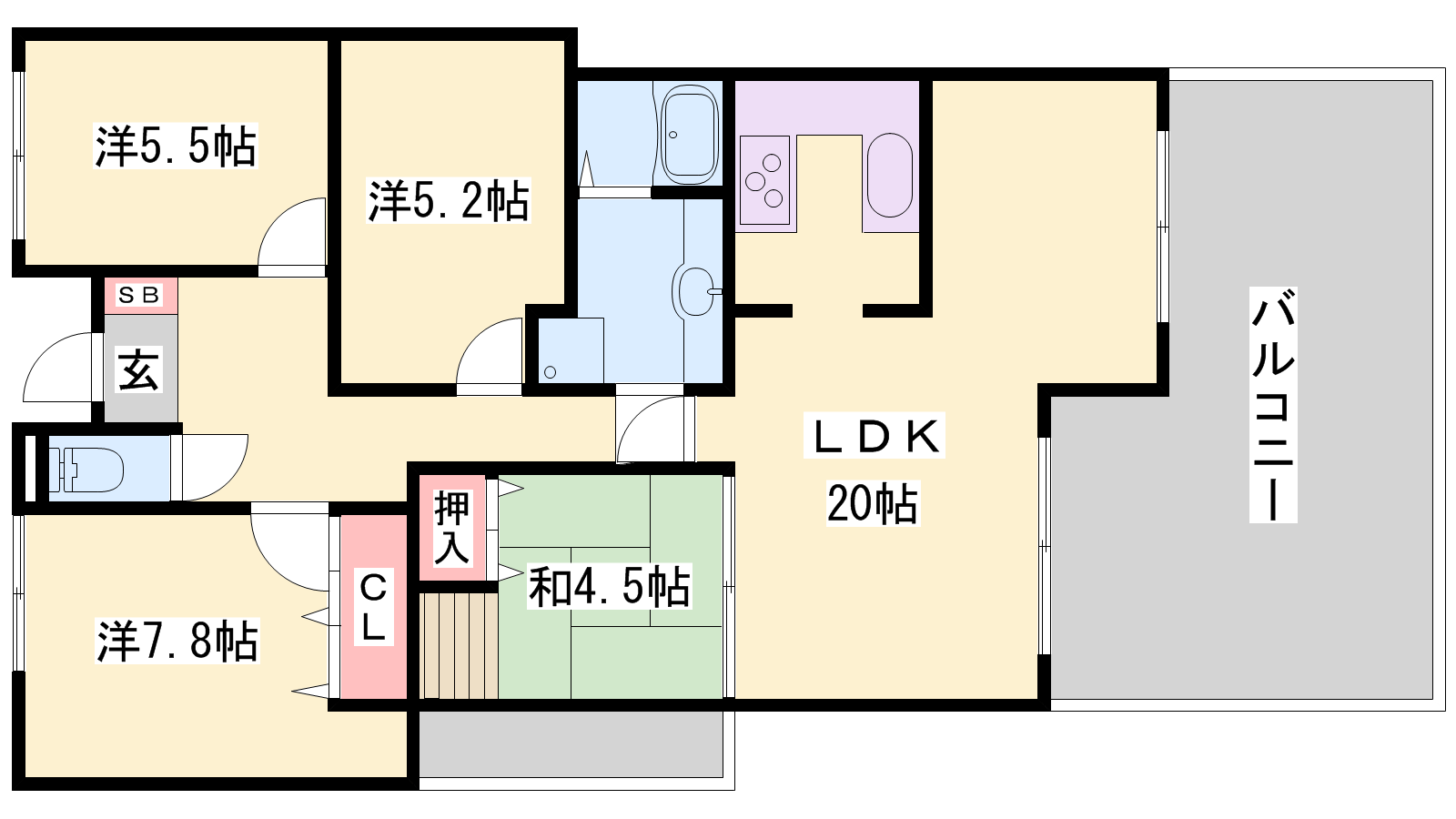 - LDK20帖、洋室7.8帖、洋室5.5帖、洋室5.2帖、和室4.5帖