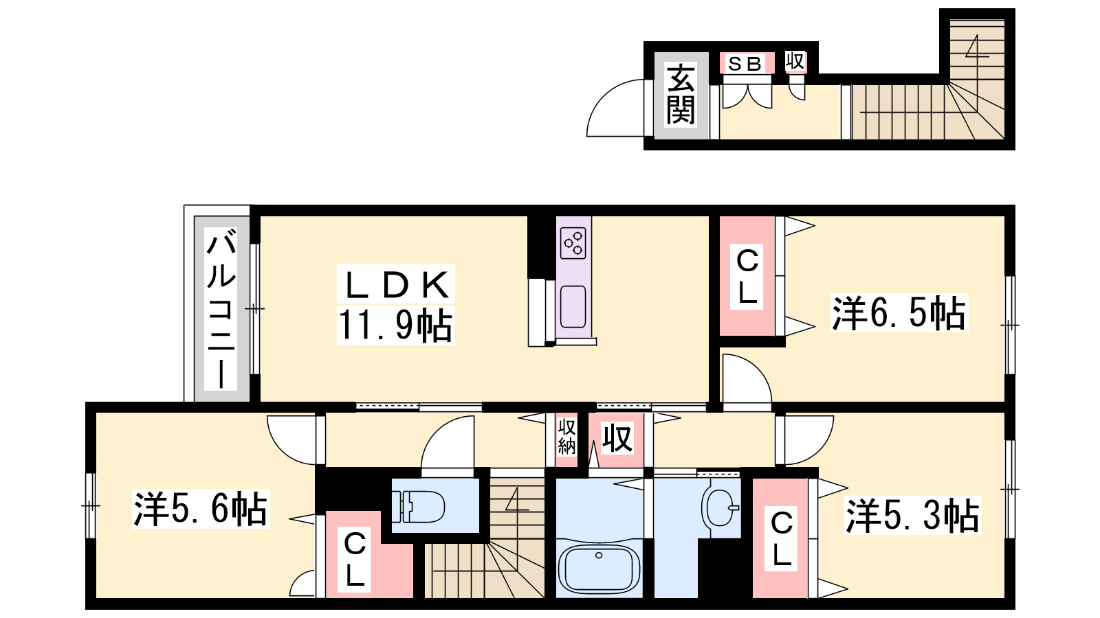 - LDK11.9帖、洋室6.5帖、洋室5.6帖、洋室5.3帖